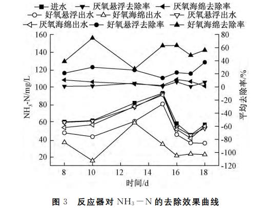 网状海绵填料及圆形悬浮填料两种填料的填充比均为40%,4个反应器COD和NH3-N的去除效果分别如图2、图3所示。